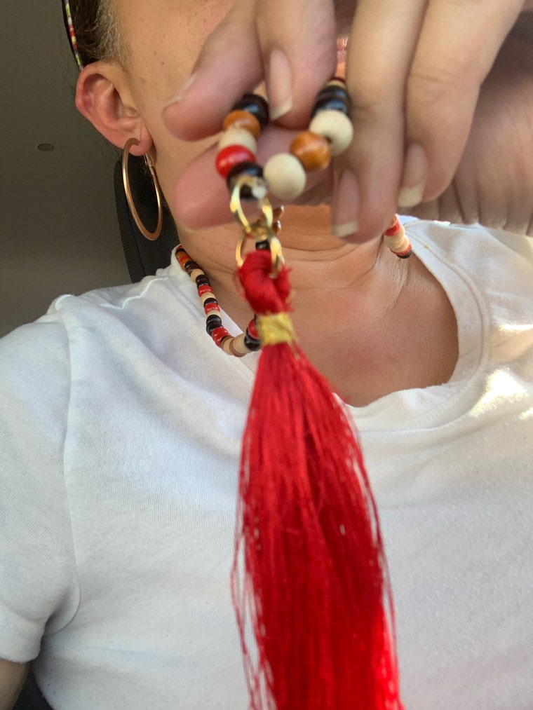 Long red tassel necklace flow.