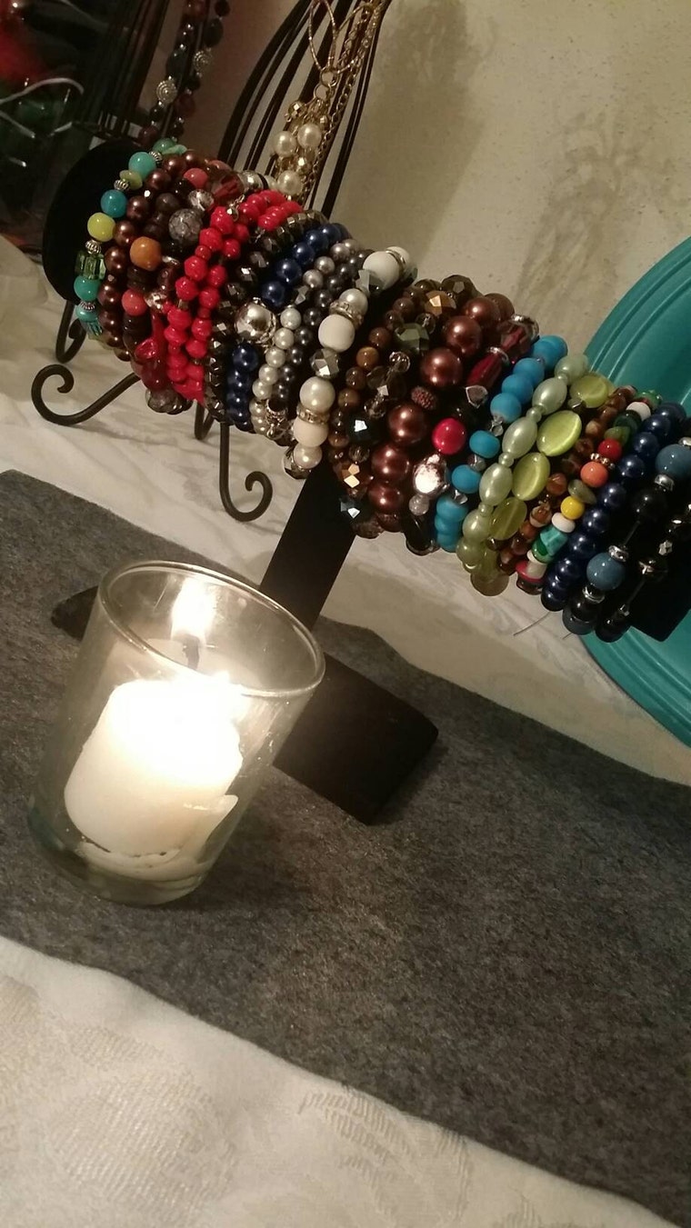 Handcrafted bead bracelets.(my display table for pictures) -