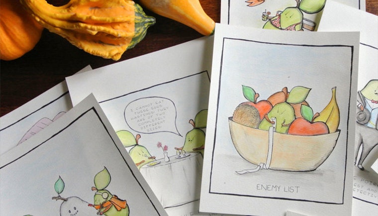I started drawing the comic strip, Angry Pear (www.angriestpear.com), a little over two years ago. Initially it began as a characterization of my own life. I coined the word "pearish" among friends and family as a way of describing peevish, fickle and often silly behavior. It's part autobiography, part slapstick with a lot of puns and childlike silliness. A little while later, I started making cards and little polymer pears. I keep adding new pears and new cards as I go forward.