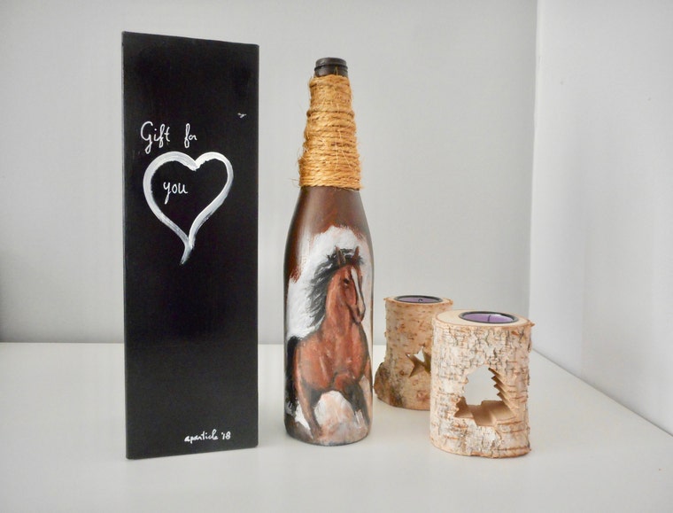 One of our gift packages for hand-painted empty wine bottle. Made from an empty whiskey box.