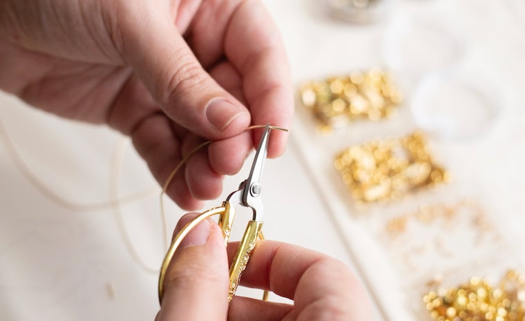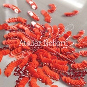 J’utilise de l’organza ou du tulle de soie, des perles de cristal, des perles de verre vintage, des strass Swarovsky, des paillettes françaises, des pierres naturelles, etc…