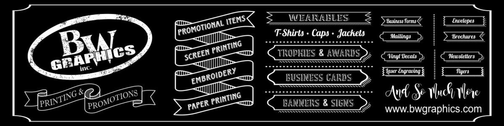 Die erste Expansion von B-W im Jahr 1992 bot Platz für neue Dienstleistungen, einschließlich Grafikdesign. Eine zweite Erweiterung im Jahr 1997 verdoppelte die Servicekapazität von B-W, als Pressen und Bindereiausrüstung in das neue Gebäude auf der Rückseite umzogen, so dass Platz für Computerdesign und ein Büro für Werbeartikel und ein Showroom mit Blick auf Westview Dr. Mit 12 Vollzeit- und 4 Teilzeitmitarbeitern ist B-W Graphics stolz darauf, wie viel es für Kunden tun kann, vom Vollfarbdruck und der Mailvorbereitung bis hin zu jeder Art von Siebdruck- oder besticktem Wearable.