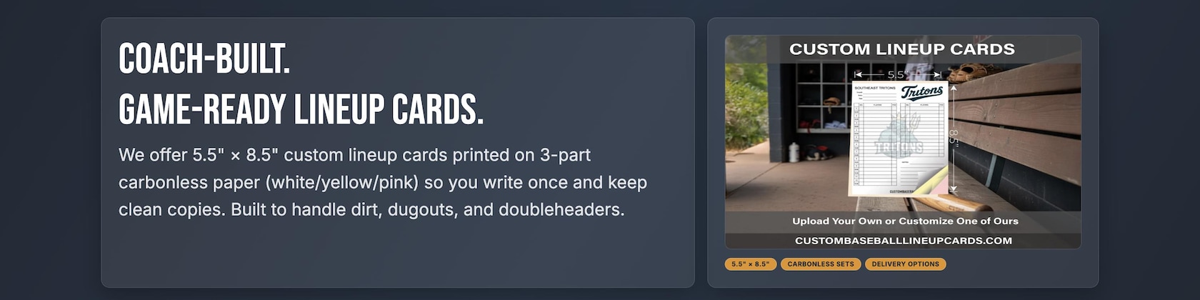 All lineup cards are 5.5" × 8.5", the perfect size for dugout use and clipboard-friendly.