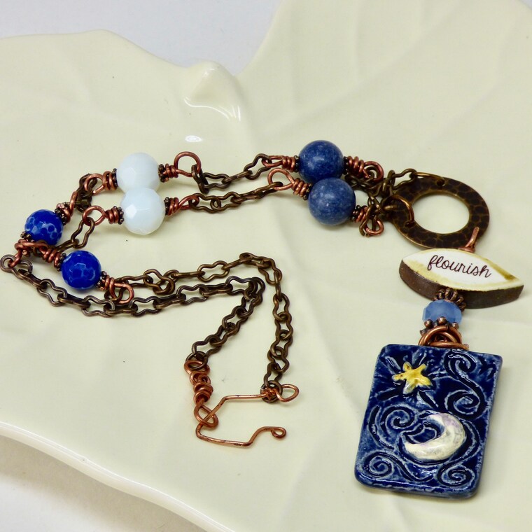 At the core of Bay Moon Design is quality, sustainability and supporting local exchanges. I buy locally when possible. I try to use materials from nature, along with locally sourced, eco friendly supplies. I love to use handmade components that I make or components made by other artisans. Ceramics are a favorite that I frequently use in my jewelry. Craft shows that I participate in are all local. I donate jewelry or cards to local charities. Everything is one of a kind or produced in small batches to preserve the fun of wearing something unique.