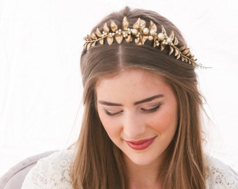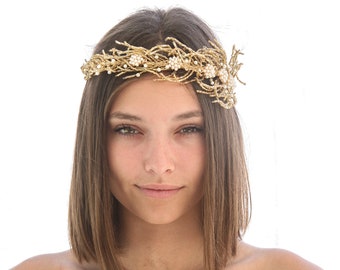 Gold Beaded Crown with Pearls Wedding Headband of Gold Beads Boho Wedding Headpiece