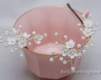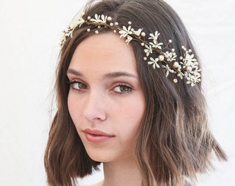 Flower Wedding Hair Vine of Small Ivory Flowers and Champagne Pearls, Wedding Headpiece Ivory Daisy Headband Beaded Wreath Bridal Headpiece