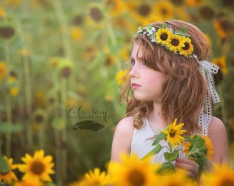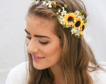 Sunflower Flower Crown with Green Leaves and Babies Breath Wedding Hair Yellow Floral Halo Boho Wedding Bridesmaid or Flower Girl Headband