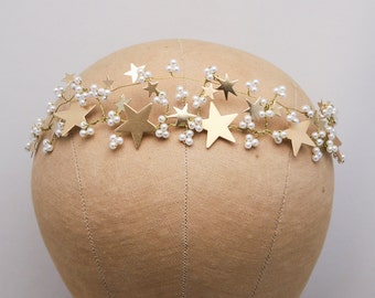 Rustic Gold Wedding Crown Woodland Wedding Headpiece with Vintage Stars and Pearls, Celestial Wedding Boho Wired Gold Tiara Hair Accessory