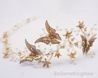 Rustic Gold Hair Vine of Metal Butterflies and Flowers, Beaded Woodland Wedding Hair Halo Flower Crown Boho Wedding Bridal Hair Wreath