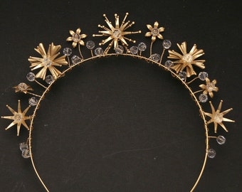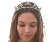 Gold Celestial Wedding Crown Crystals and Stars Headpiece Metal Star Headband Boho Wired Gold Tiara Star Hair Jewelry