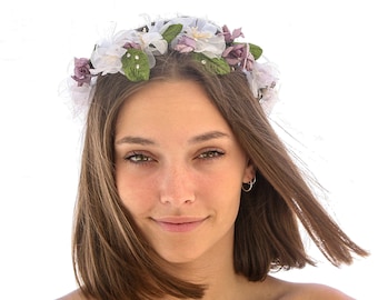 Vintage Flower Crown In Lavender and White with Green Leaves Wedding Halo Flower Girl Crown Bridesmaids Hair Maternity Photo Shoot Prop