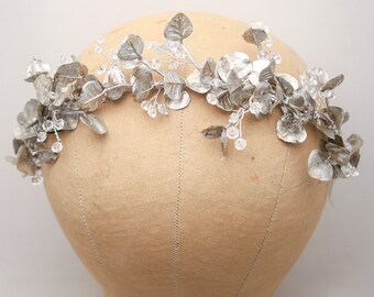 Silver Eucaliptus Leaf Headband with Crystals Boho Wedding Headband with Silver Leaves