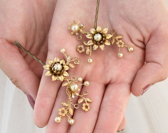 Gold Flower and Pearl Bobbie Pins, Brass Flower Hair Accessories, Wedding Hair, Vintage Wedding Hair