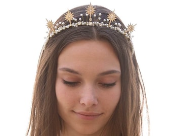 Gold Star Celestial Wedding Crown Rhinestone and Pearl Headpiece Metal Star Headband Boho Wired Gold Tiara Star Hair Jewelry