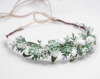 Green Succulent Flower Crown Wedding Headband, Rustic Bridal Succulent Flower Wreath of Green Succulents, Baby's Breath and Small flowers