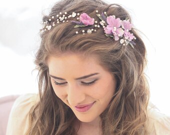 Wedding Hair Vine of Lavender Flowers Pearls and Rhinestones, Wedding Flower Crown Breial Headpiece Garden Wedding Headband Beaded Hair Vine