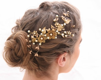 Gold Bridal Hair Comb, Rustic Bronze Wedding headpiece, Golden Boho Wedding Hair Accessory with Metal Flowers and Leaves
