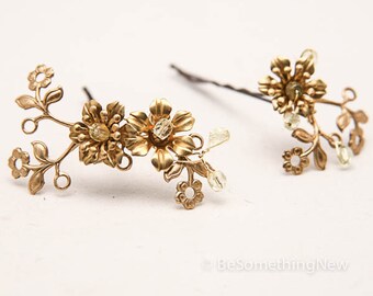 Vintage Flower Bobbie Pins, Brass and Gold Flower Hair Accessories, Wedding Hair, Vintage Wedding Hair