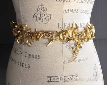 Gold Wedding Dress Sash, Bridal Gown Belt of Golden Leaves and Berries, Grecian Gold Dress Sash, Flower Dress Belt with Ribbon Tie