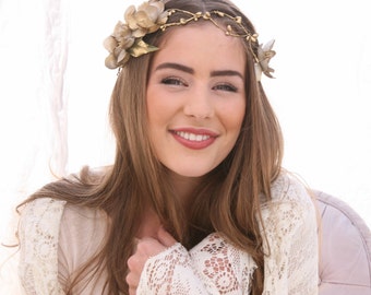 Gold Wedding Woodland Flower Headband with Gold Flowers and Ribbon Ties, Flower Crown, Boheimian Festival Hair Accessory Golden Wedding Hair