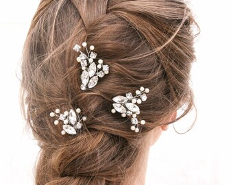 Wedding Hair Pins of Flowers and Pearls Bridal Bobby Set of Three, Beaded Flower Hair Jewelry, Beaded Babies Breath Headpiece