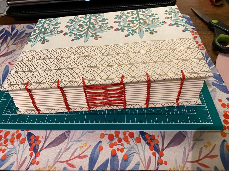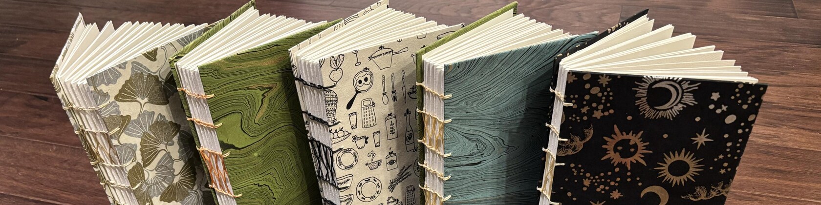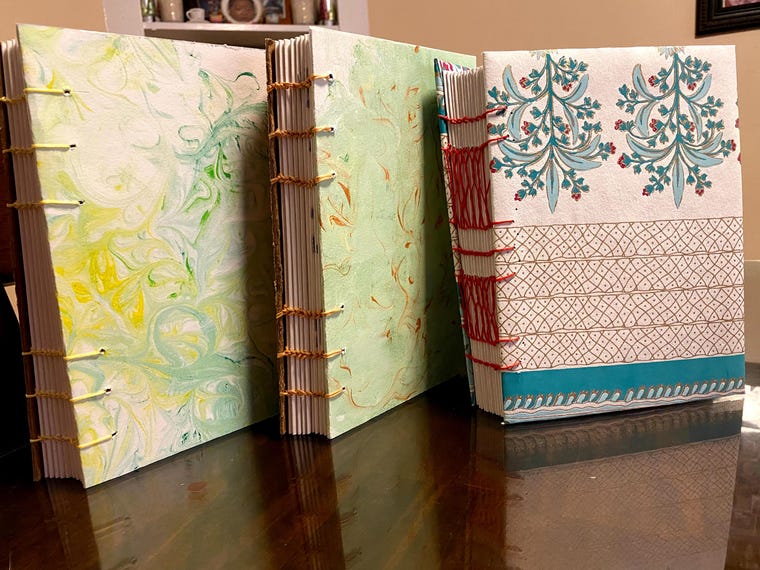 The middle and left notebooks are some of my earliest works. I experimented with marbling the cover papers myself
