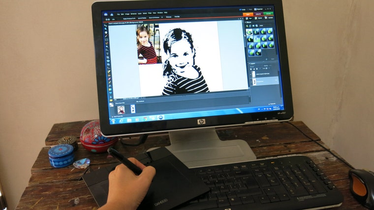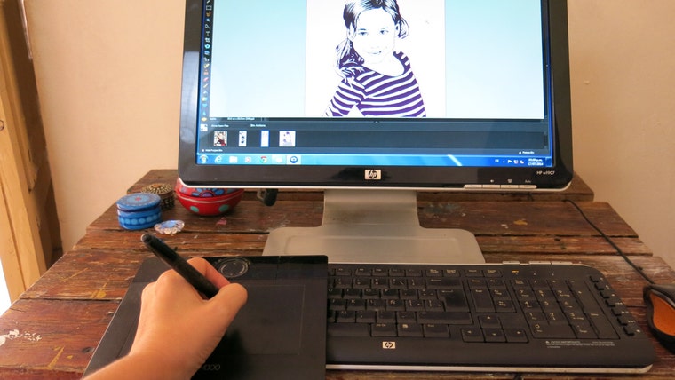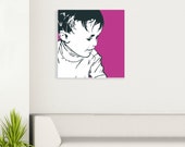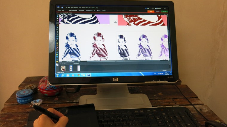 A few years ago I moved to a new house where I didn't have a garage and was unable to spray-paint my portraits. So now I design the portraits as usual -- on my laptop (using my trusty Wacom pen and tablet!) -- and then send the design off for printing and shipping with a US-based printer. In some ways this is better for my customers, because the portraits now arrive already stretched and ready to hang on a wall.