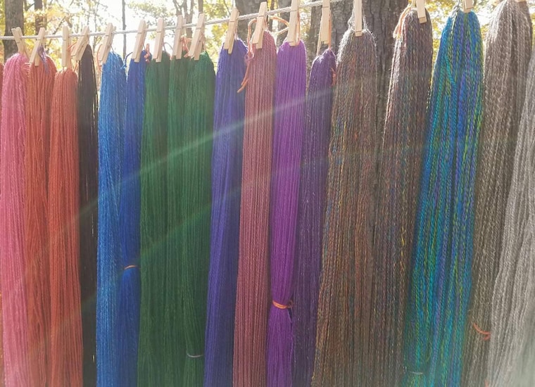 Handspun yarns drying in the sun. -