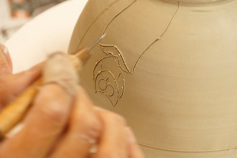 I free hand carve my designs onto the clay while it is still soft. -
