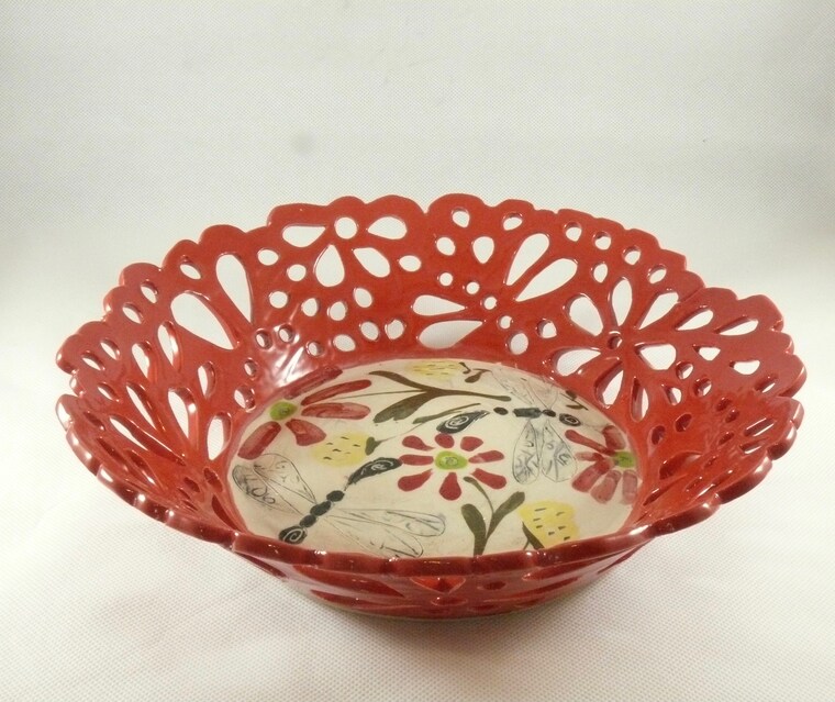 This cut out fruit bowl is a favorite design of mine. Free hand design is incised into the damp clay.