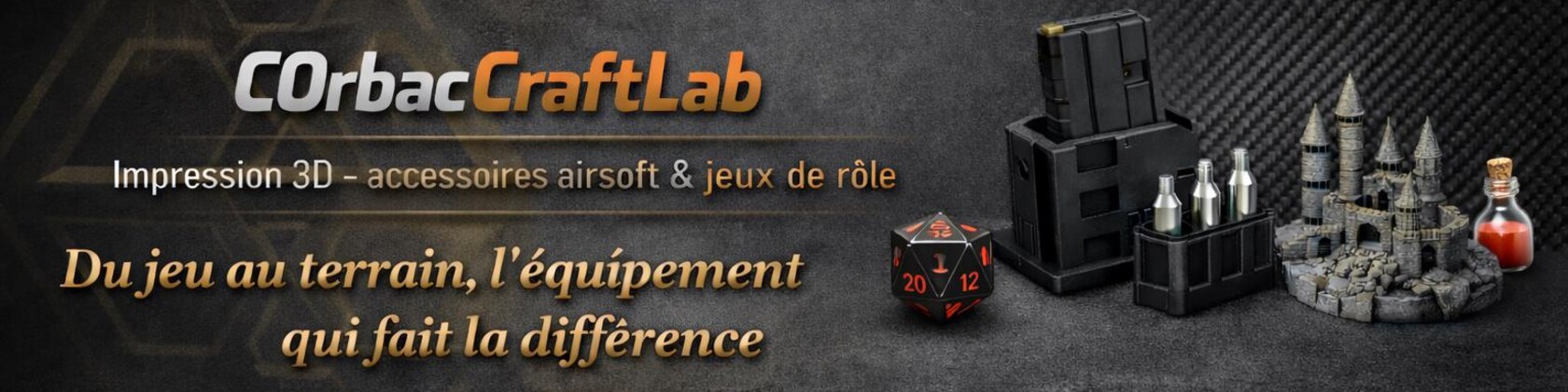 C0rbacCraftLab est un atelier d’impression 3D dédié à la création d’accessoires et d’équipements pour l’airsoft et les jeux de rôle. Des produits pensés pour être utiles, solides et immersifs, du terrain à la table de jeu.
