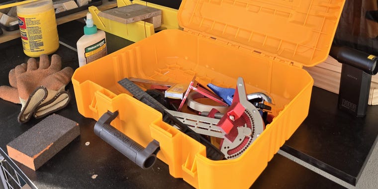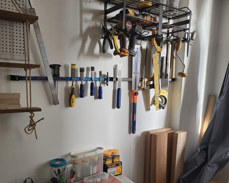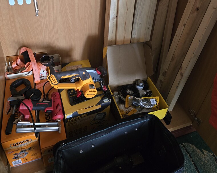 Power tools and wood supplies kept inside wardrobe cabinet
