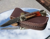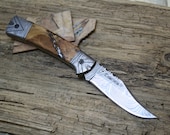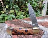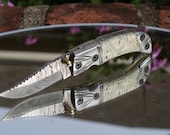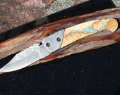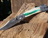 The real artistry comes in the handle materials. Choice and exotic hardwoods from around the world which are hand shaped, inlaid and/or hand carved are used on many of his creations. Horn and antlers are a favorite medium for handles, each being hand selected and shaped much like wood. Popular are his handles fashioned from bones, teeth and jaw bones. These are meticulously drilled, shaped and polished producing a natural looking yet functional handle. Semi-precious minerals and stones such as turquoise, onyx or malachite have adorned many knives. Mother of pearl, abalone and other shell materials create "pocket jewelry" in his knives. His favorite and among the most popular material used are fossils. These include teeth from prehistoric and extinct animals or once living coral from the sea. This very rare and expensive materials are extremely difficult to obtain and even harder to work with. Most are very fragile and require a delicate touch. Once fitted against the metal knife components they provide a strong and unique handle. These knives provide a truly unique and one of a kind collector's piece of truly historic significance and why they are his favorites.
