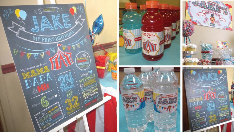 Circus themed party featuring milestone poster, water bottle labels, gatorade labels and vinyl candy bar banner
