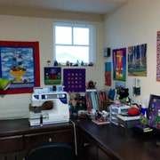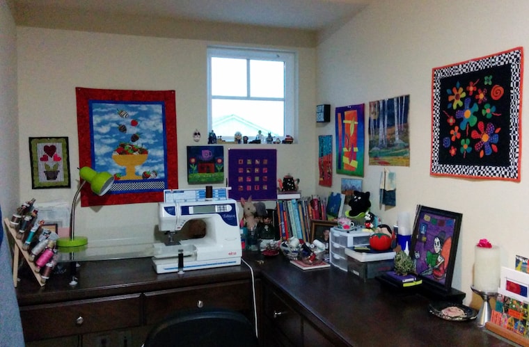 All diese kreativen Aktivitäten finden in meinem Heimstudio statt. Dort bin ich von wunderschönen Quilts umgeben, die von Lehrern und Freunden angefertigt wurden. Diese farbenfrohen Quilts sowie kreative Bücher und besondere Kunstwerke inspirieren mich in meinem kreativen Prozess.