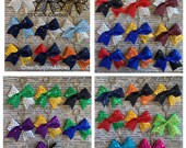 Every bow starts out as a plain grosgrain ribbon, shiny fabrics, glitter vinyl, sequins and rhinestones are added to make each bow. Dye sublimated bows start out as white grosgrain ribbon with white glitter vinyl bonded to it. A graphic art program is used to create the design. The design is then printed using a special printer and paper. Lastly, the design is pressed onto the ribbon using a very high heat to transfer the ink directly onto the ribbon. The ink will not crack or fade. The possibilities for designs are endless!