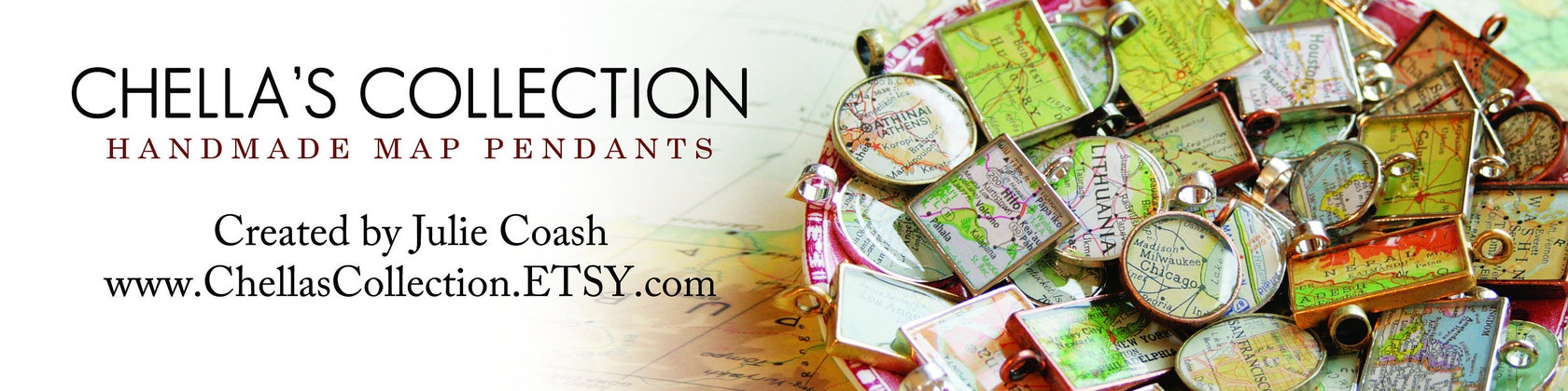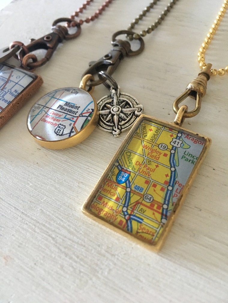 My handmade Map Pendants are meant to symbolize special places that bring you fond memories. Necklaces-Keychains-Bracelets-Gifts!!. I use maps from my personal collection of original maps and atlases(many vintage)that I have gathered for years from tag sales and estate sales(over 200 atlas books). Name your City! Name your Favorite place! Take a look at my Custom Order section to view your personalized pendant options: