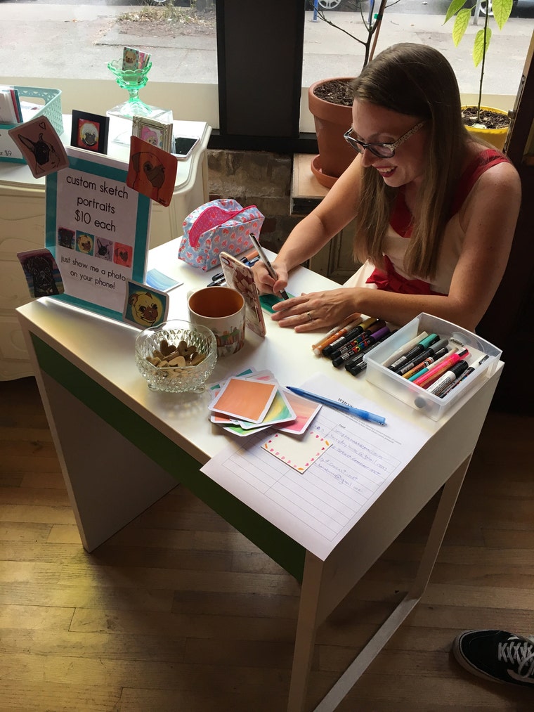 Drawing pet portraits live at Champagne Room Gallery in Portland Oregon. -
