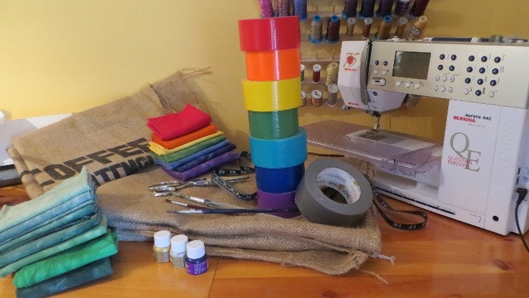 My stoles are made of hand-dyed fabrics, recycled, locally-sourced burlap coffee sacks, duct tape and more! -