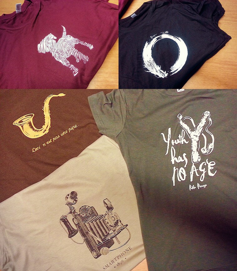 Screen printing has since become a passion, it's process an obsession! Inks, spatulas, lithographic films, developing and printing -the whole process transformed into a slow, adventurous journey of self-discovery, a kind of meditation about life. As a printing method, screen printing provided the medium by which a childhood passion could be realised: years of experimentation on hand-drawn T-shirts have finally found their true expression. Manually still, but with indelible inks and the ability to detail design. How liberating!