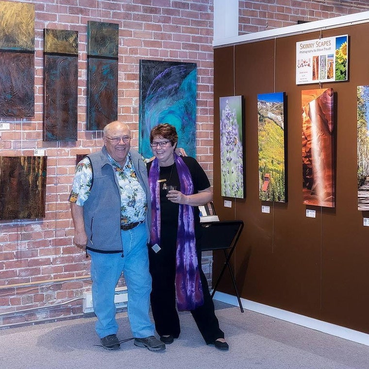 I love creating! This photo is my artist husband, Steve Traudt and me at our Gallery opening. -
