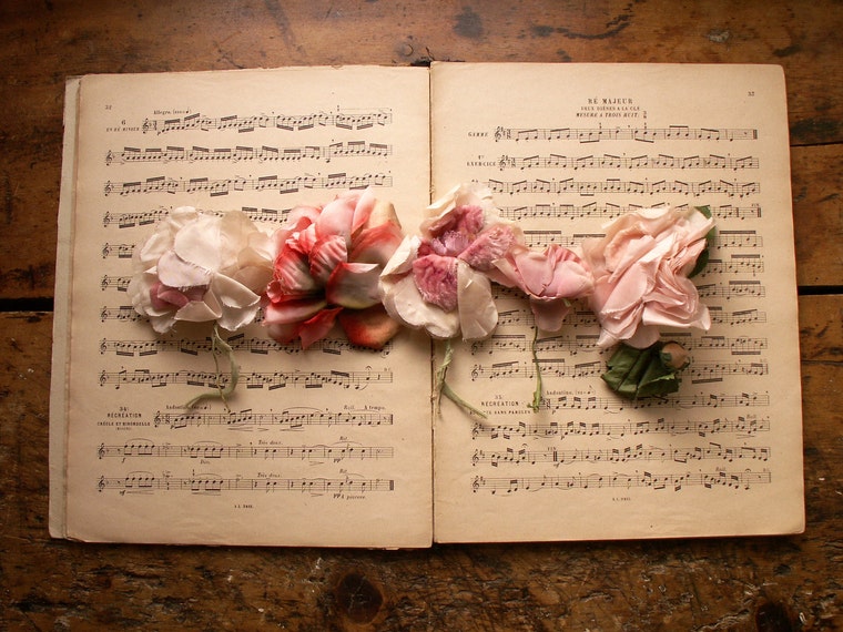 The faded beauty of vintage millinery flowers is elevated by the pages of an antique french music book. -