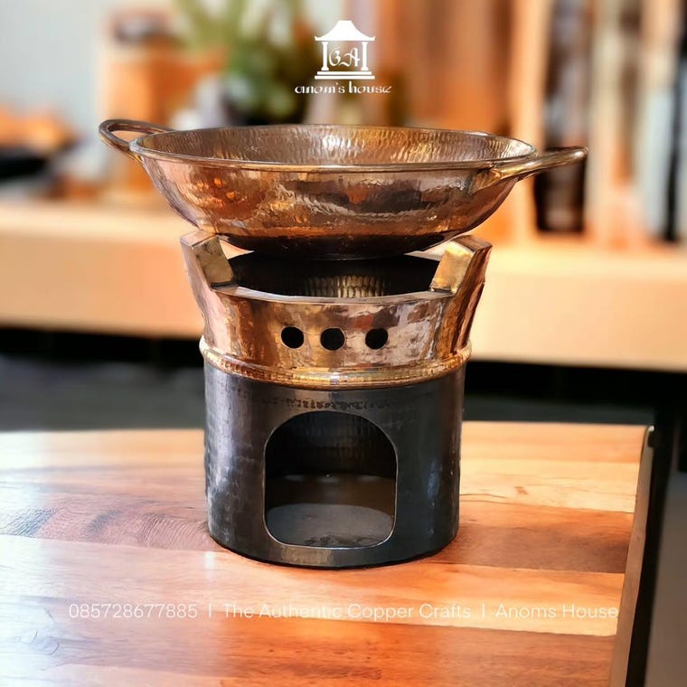 Hand-hammered copper mini wok and stove set. Perfect for unique dining or decorative accent. -
