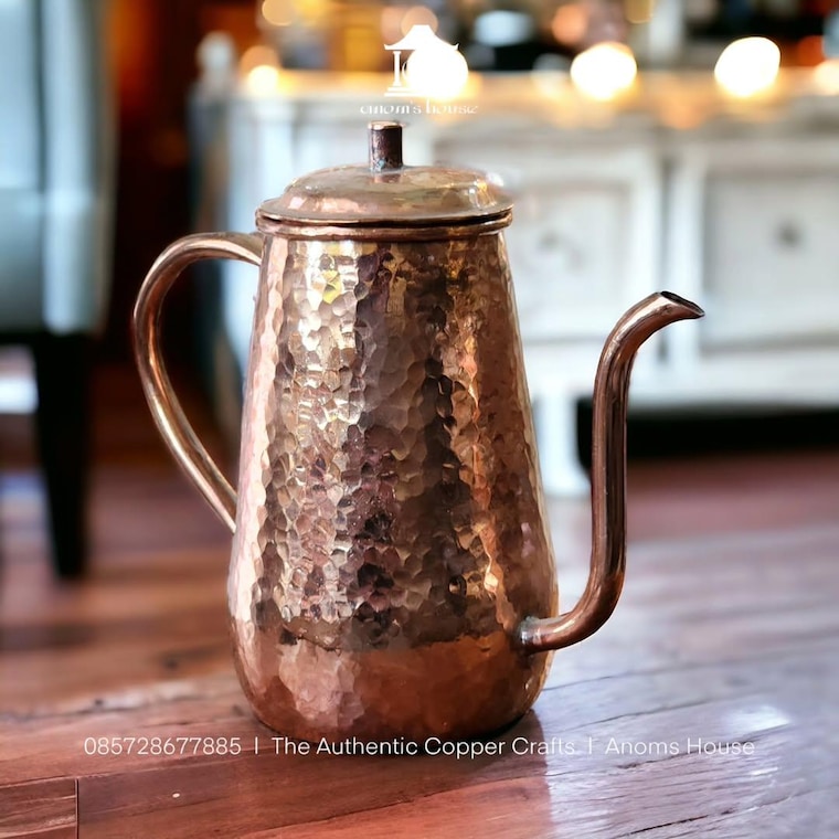 Elegant gooseneck copper kettle. Hand-hammered texture for stylish coffee or tea brewing.