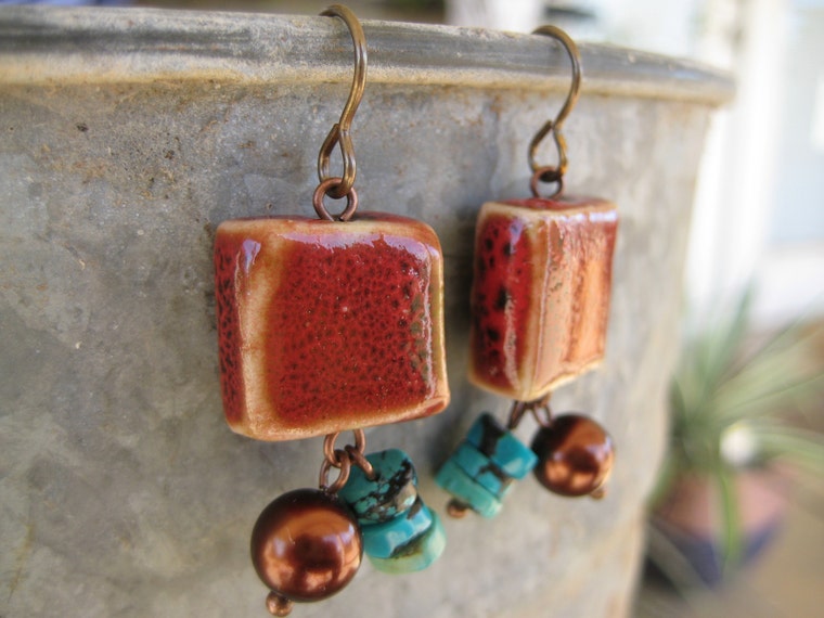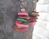 5 out of 5 starsThese earrings are so cute! They are made with pink and green shell beads and are done in alternating colors. I love that they are lightweight and easy to wear. The earrings are finished off with nickel-plated ear hooks. The overall look is charming, soft, and feminine. The workmanship is excellent. The colors of these beads are vivid and clean. The seller used beads that were the same size and then stacked them nicely so that they line up and aren't curved. Great job! The earrings were nicely packaged with a thank you card attached and then the seller tied both together using a beautiful blue ribbon. I just really love these earrings and yes, they remind me of chiclets, too. I could just eat them up! Fantastic Etsian and super-fast shipping. Thanks so much!