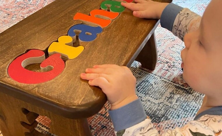 Each stool is carved from solid hardwood, routered smooth and sanded. We designed them to be a forever keepsake that your little one can use through their early milestone years. It's a keepsake that will last for years to come. Customize the stool: choose the finish, leg design and lettering colors to make a special, one-of-a kind gift that is both functional and fun.