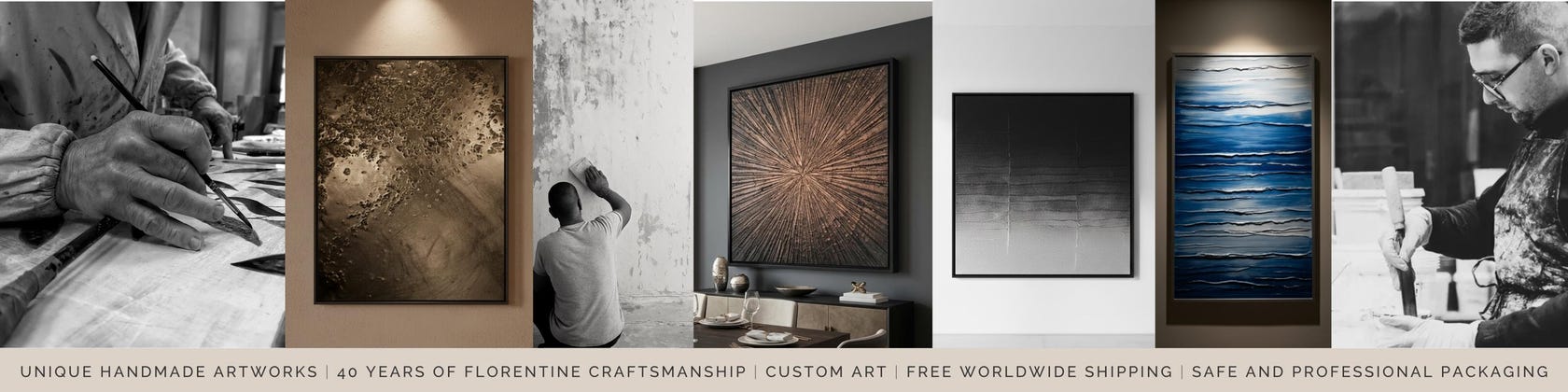 We are Paolo, Leonardo, and Lorenzo, Florentine artisans and founders of Paolo Flori Atelier Srl, a family company that has been creating luxury artistic finishes, custom artworks, and interior art and design solutions for over forty years.
