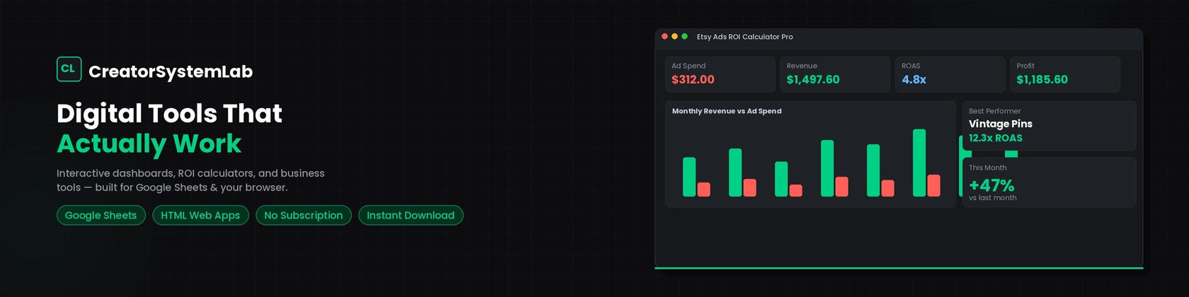 Creo herramientas digitales para creadores y vendedores: paneles interactivos, calculadoras de retorno de la inversión y sistemas de productividad. También dirijo VaultAndVesselStudio en Etsy.