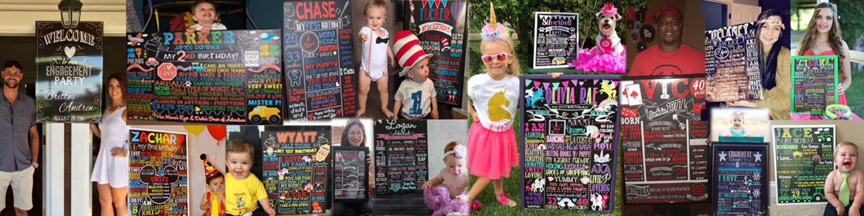I started in kid designs, mainly the birthday style chalkboards. But as you can see by browsing through my shop my business has grown into much more than just that. I do it all now..weddings, birth announcements, birthday parties (kids and adults), holidays, showers, business signs and almost anything you can print we can make!