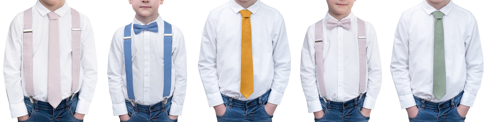 Our accessories make perfect combinations, such as dad and son bow ties, bow tie and suspenders, tie and suspenders, bow tie and pocket square, tie and pocket square.